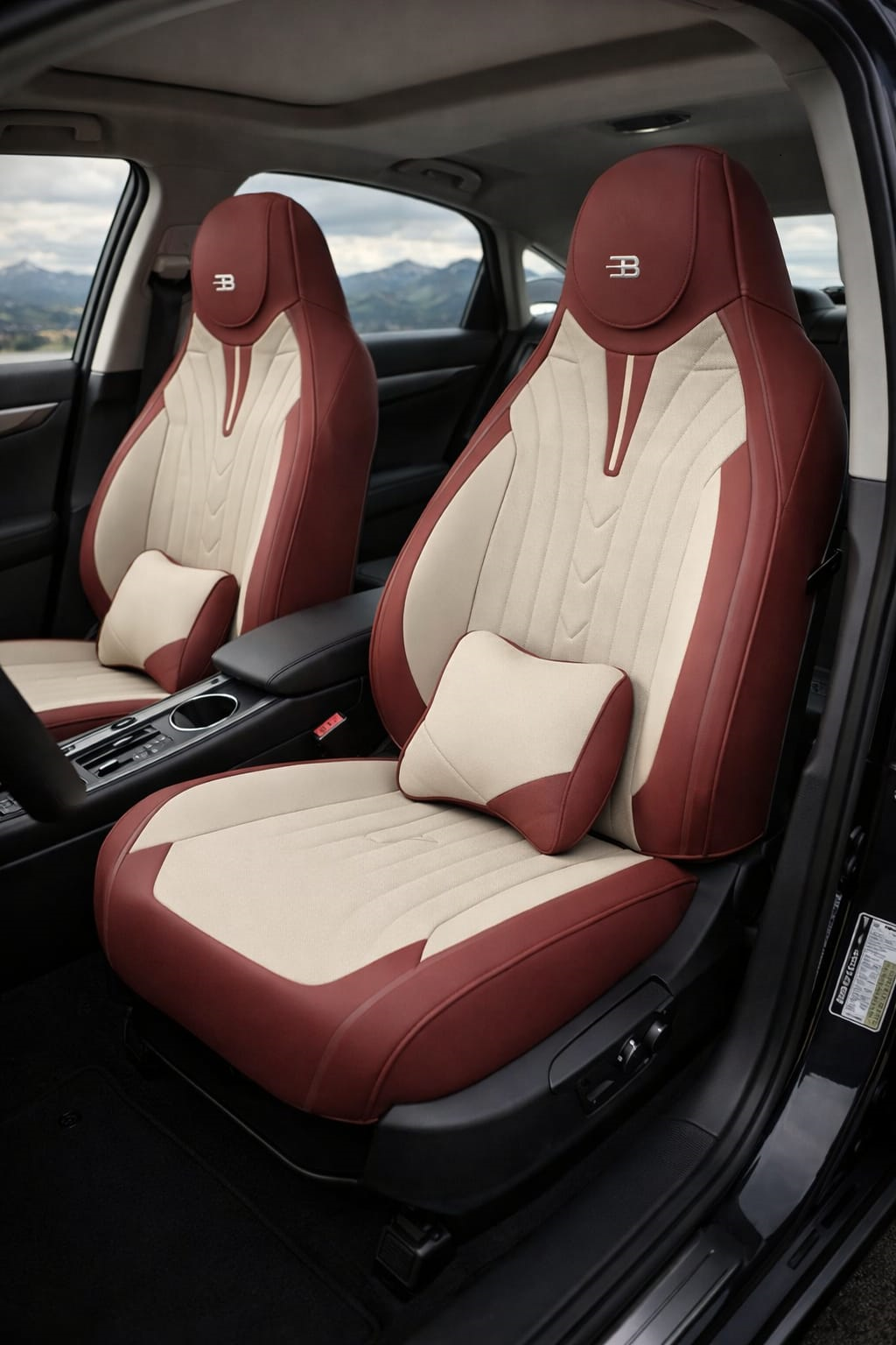 המושבים האלו מעוצבים בקו יוקרתי ואלגנטי, בשילוב מושלם של בורדו עמוק עם בז' שמנת רך ונעים לעין.